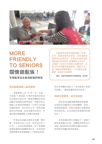 苓雅監理站提供高齡駕駛人友善、 支持、尊重與便民的環境。常有高齡者 換照時忘記帶照片,苓雅站為避免造成 高齡者的來回奔波,影響路途上的安全, 已購買一台相片快照機且免費提供,並 配合不定期醫院駐點服務,期能打造一 個「高齡友善換照環境」,共同營造永續、 樂齡、宜居的年長服務。